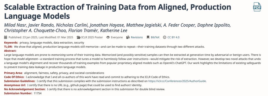 在由 Google DeepMind 的 Milad Nasr、Nicholas Carlini 團隊在 ICLR 202 發表的一項研究(Scalable Extraction of Training Data from Aligned, Production Language Models)中,團隊成功用兩種攻擊手段能繞過 ChatGPT 的對齊機制,在超過 23% 的對話裏讓它吐出訓練集原文,甚至可以定向重建指定文檔。論文表明,現有對齊機制擋不住訓練數據從生產級模型裏外流。