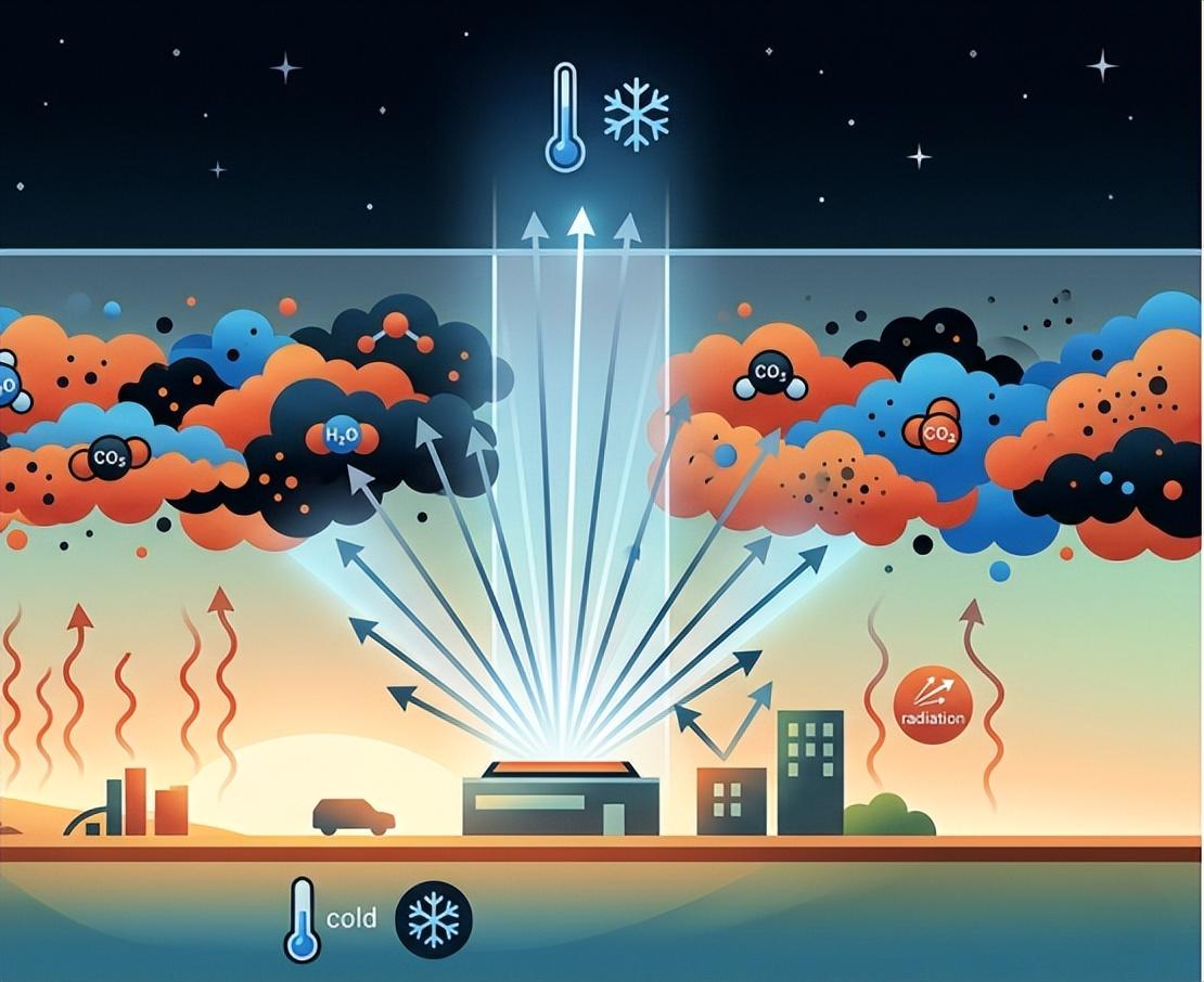 爲了克服這一侷限,輻射製冷技術成爲近年來備受學術界和產業界關注的方向。其原理在於,地球大氣在波長約 8 至 13 微米的中紅外範圍內存在一個“大氣透射窗口”,處於這一波長範圍內的熱輻射可以直接穿透大氣層,逃逸至外太空。地球表面溫度約爲室溫的物體,恰好在這一波段具有較強的熱輻射,從而可將熱量“傾倒”至宇宙空間,,從而實現無需電力的被動降溫。