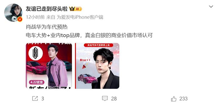 實際上,在稍微早些時候就已經傳出相關信息,表示肖戰將會代言尚界汽車。有博主也在近日發佈了一張海報,畫面包含“尚界Z7×肖戰 肖戰汽車代言即將上線”字樣,並配有肖戰和尚界Z7車型圖片。該博主稱相關TVC已完成拍攝,但4月22日的發佈會肖戰不會到場,截至目前,尚界品牌與肖戰方面尚未就代言信息作出官方確認。