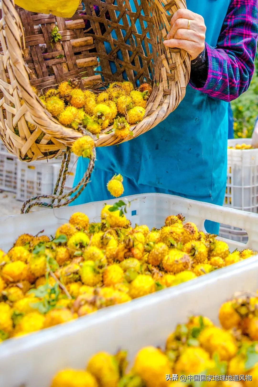 同樣在山中,與這抹翠綠相映襯的,還有一片金色的果實——貴州刺梨。它披着一身金色帶刺鎧甲,果肉肥厚,汁多味甜。這顆果子是貴州喀斯特地貌的饋贈,在貧瘠的石縫中也能頑強生長,並積蓄下驚人的能量。早在20世紀40年代,被譽爲“中國刺梨之父”的農學家羅登義就證實了其“維C之王”的地位——含量是蘋果的500倍、檸檬的100倍。