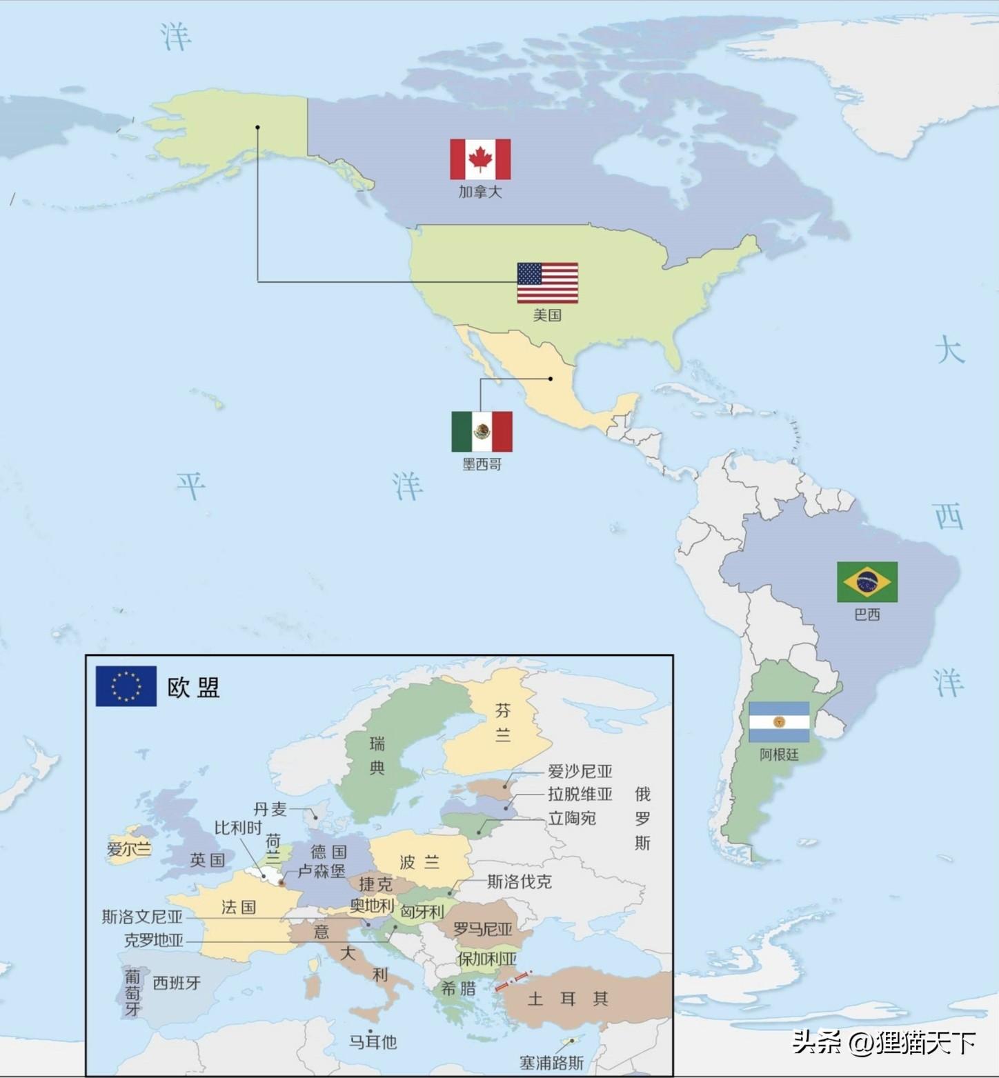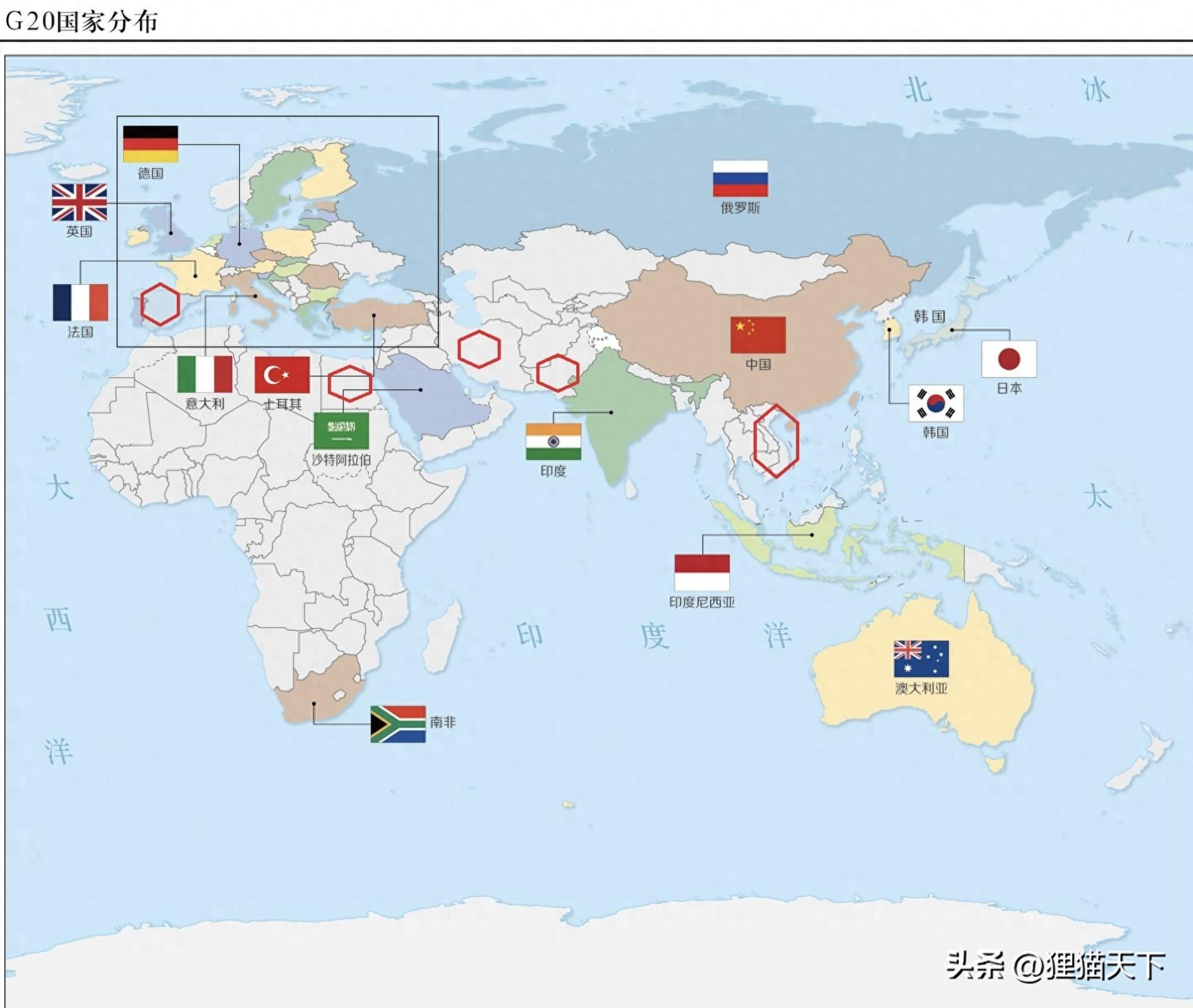 還有大洋洲有1個成員是澳大利亞,非洲也只有1個成員是南非。歐洲有5個成員,分別是英法德意和歐盟。在美洲,北美洲有3個G20成員,分別是美加墨,南美洲有2個成員是巴西和阿根廷。這些基本上都是各大洲有實力的代表,能聚在一起開G20峯會挺不容易的。