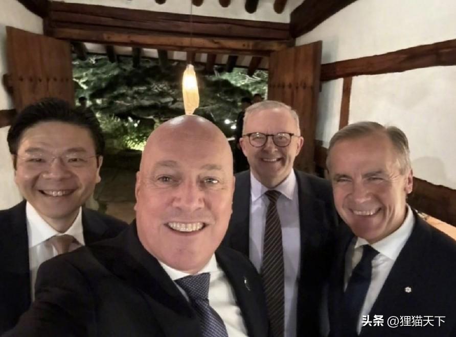 這次在韓國,卡尼看到美總提前回去,他反倒沒壓力了,還能開心的跟三個好夥伴一起合影。他們四個來自新加坡、澳大利亞、新西蘭、加拿大,雖然是三個大洲的,但都是英系國家,而且澳加新同爲五眼聯盟成員,卡尼跟他們在一起開心的露出笑容,這是發自內心的高興。