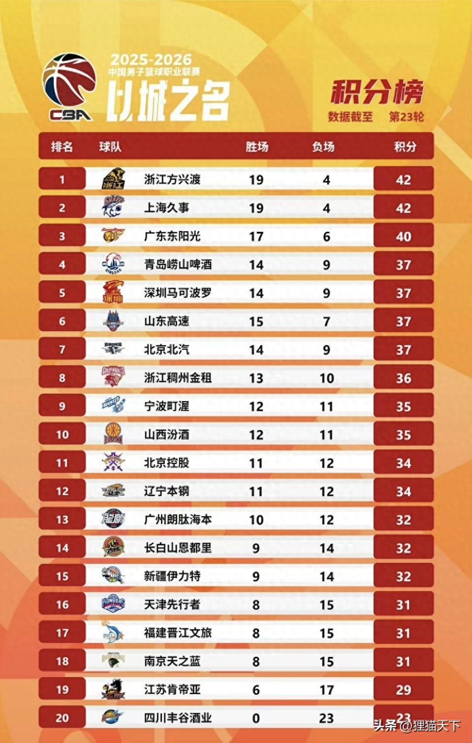 CBA聯賽第23輪結束後的積分榜排名如下,這是過年前最後一輪常規賽,接下來有一個月的窗口期,現在賽程過半,看看各隊的排名有哪些變化。