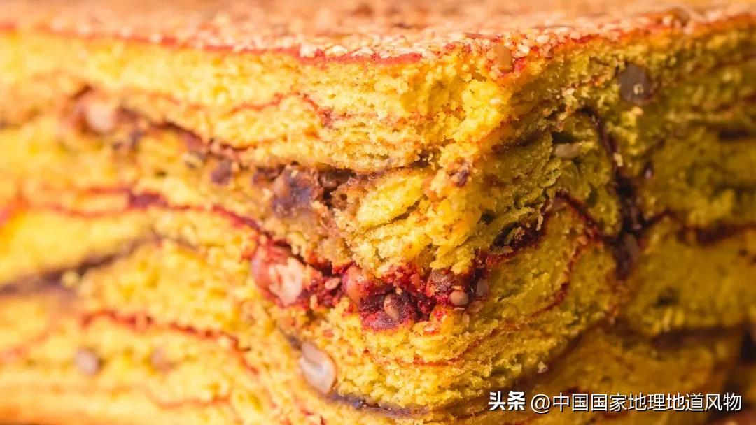 年饃,重點在於花,就算是簡單蒸一鍋白饃饃,也要用紅曲點個紅點表示喜慶。隴中永登一帶,中秋節有種獨特的千層月餅,又稱花饃饃,有時也在春節閃亮登場。這一個臉盆大的饃饃端上來,從中間開刀,裏面紅曲、薑黃、苦豆、胡麻、玫瑰等紛紛映入眼簾,簡直是“五彩斑斕的白”,放在一桌年宴之上也是光彩奪目。
