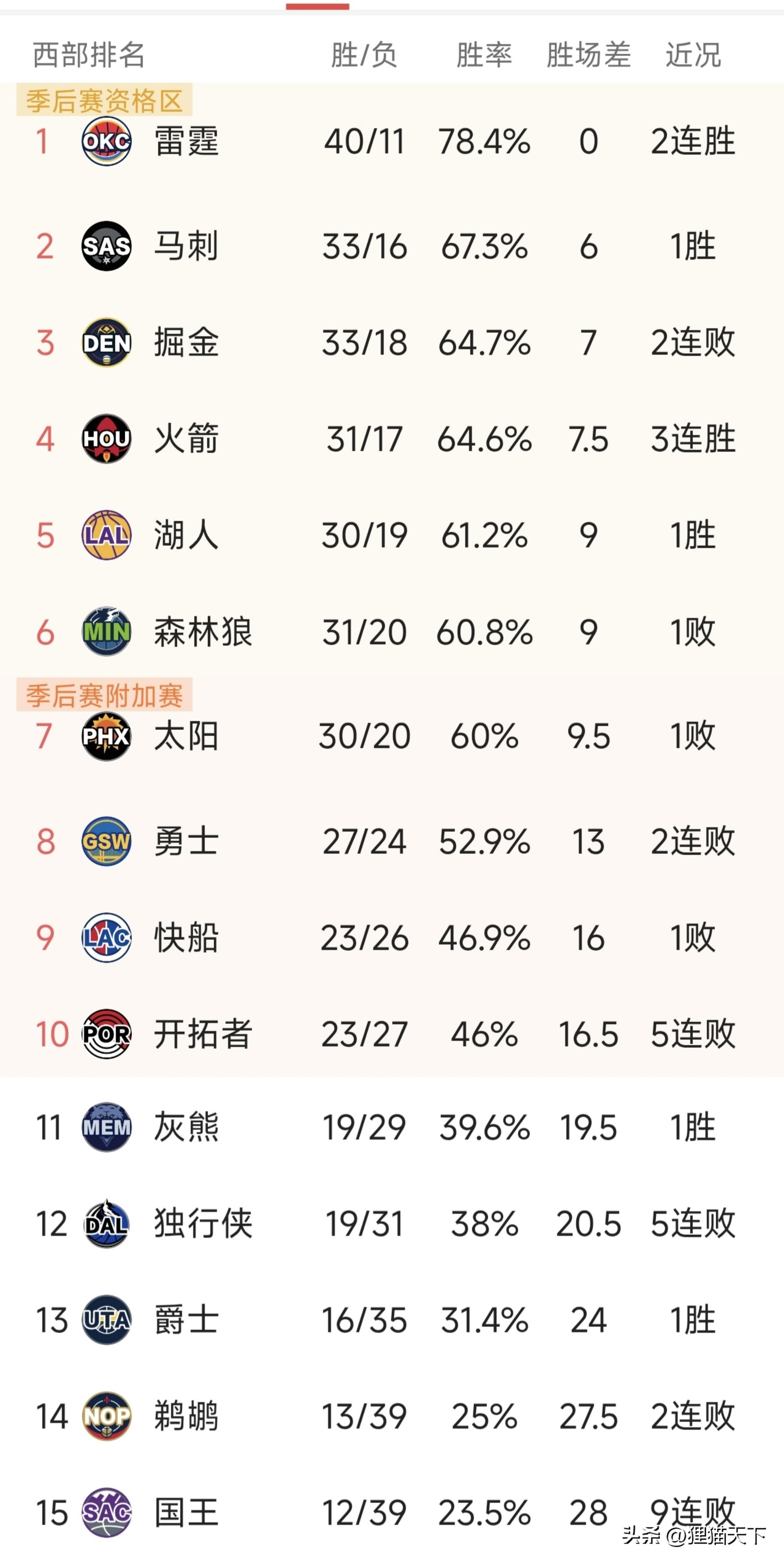 在NBA常規賽西部賽區,目前排名第一的雷霆隊40勝11負,已經拉開了六七個勝場,這優勢比東部的活塞隊更明顯。緊接着是馬刺、掘金、火箭、湖人、森林狼、太陽,這6支球隊實力非常接近,互相之間差距很小。排名後三名的國王、鵜鶘、爵士,這三隊也基本無緣季後賽附加賽。