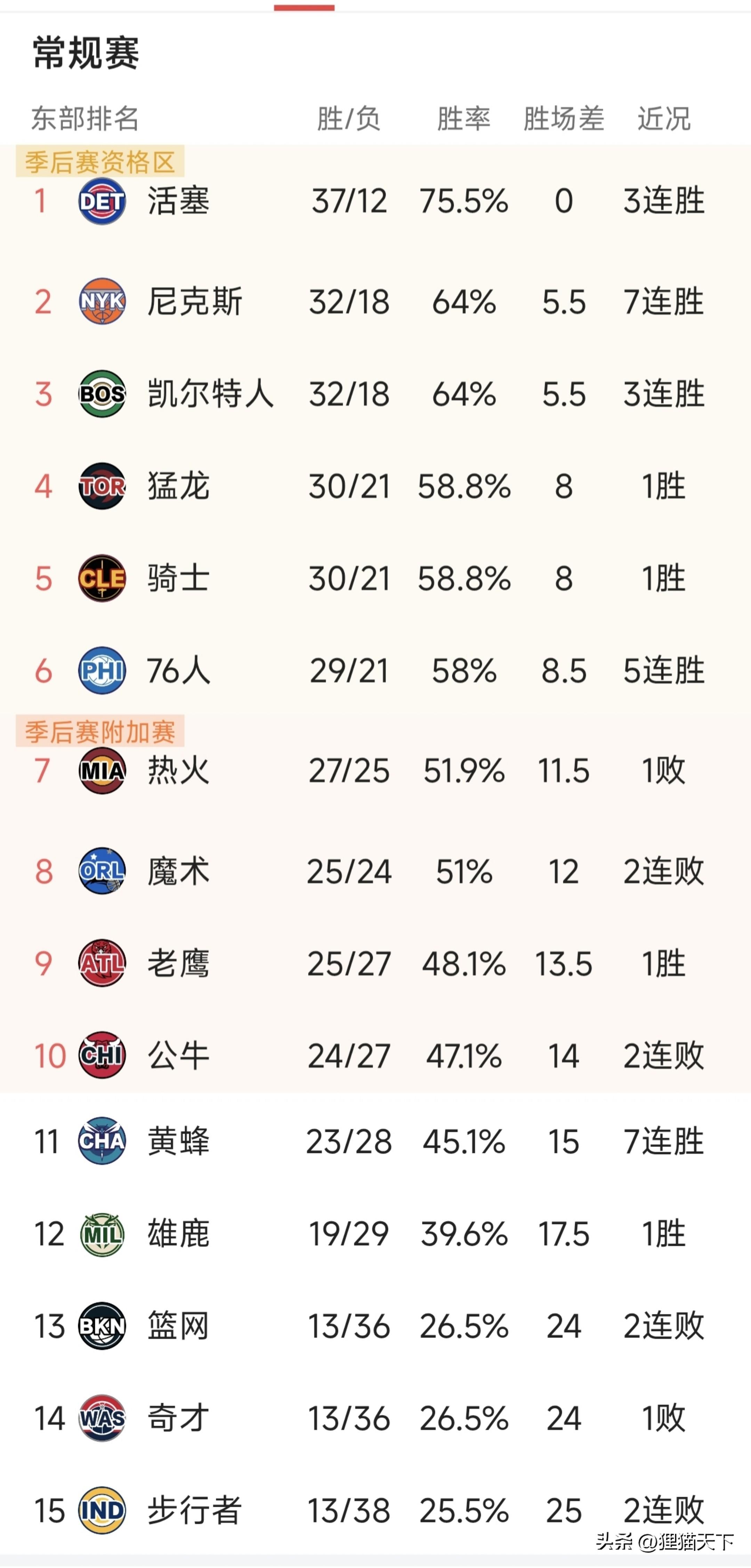 NBA常規賽東部排名