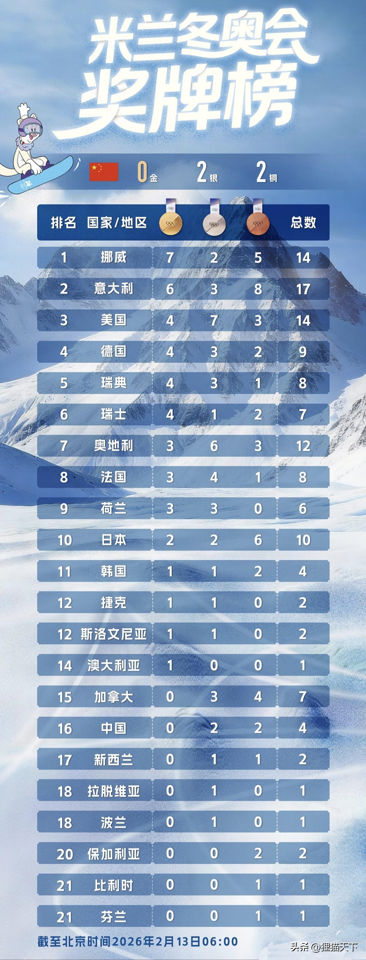 在實時更新的獎牌榜上,目前已有22個國家獲得獎牌,芬蘭和比利時排名並列榜尾。已經得到金牌的國家有14個,其中包括大洋洲的澳大利亞,這也是澳洲在米蘭冬奧會的首金,選手來自男子自由式滑雪雪上技巧。