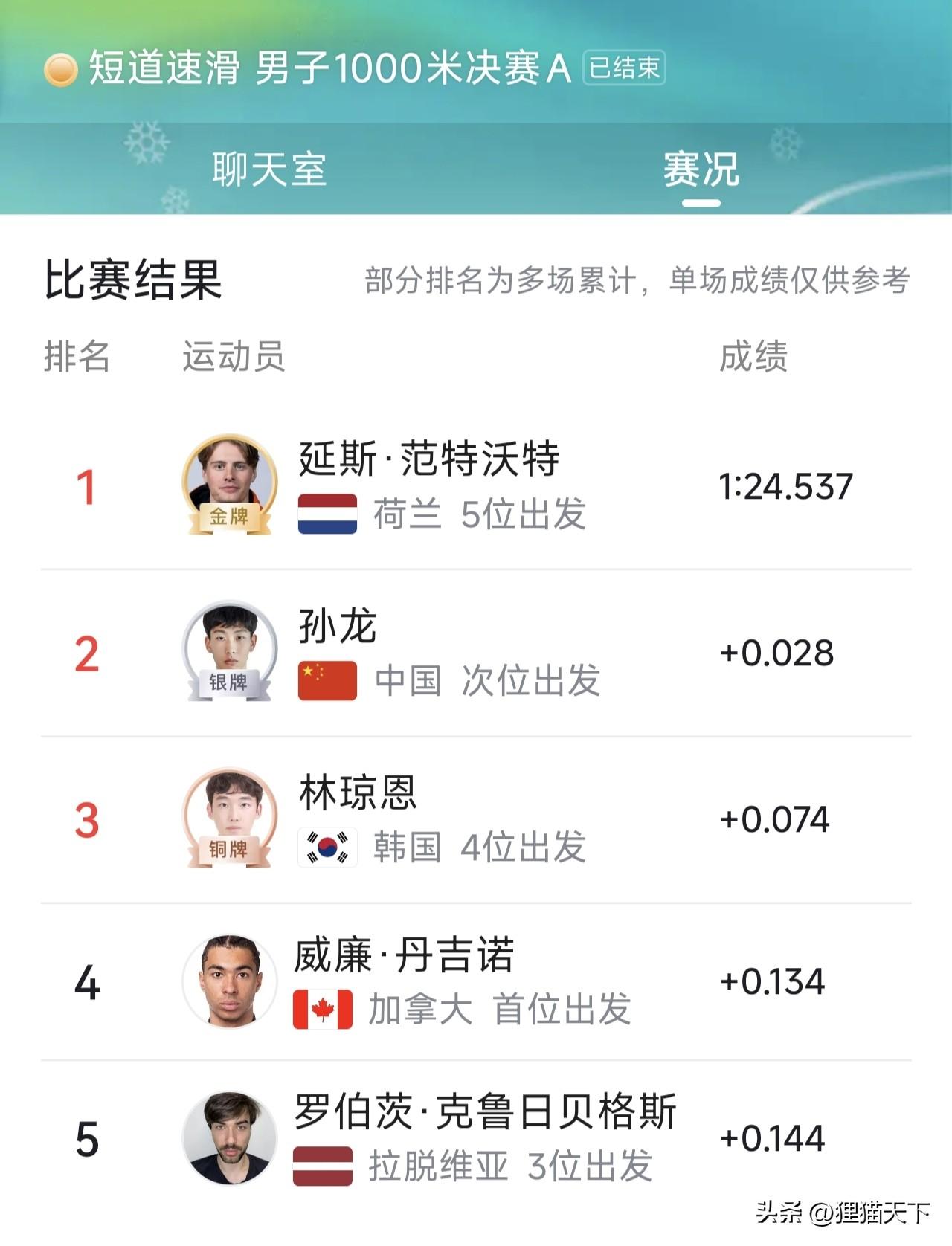 在短道速滑男子1000米A組決賽,這次共有5位選手角逐獎牌,比賽結果是荷蘭的範特沃特拿到金牌,孫龍銀牌,韓國的林瓊恩銅牌,加拿大選手第四,拉脫維亞選手第五。比賽過程直到最後一個彎道才上演反超,中韓選手都是從外道超上來的。