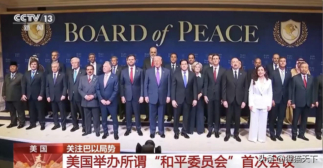 “和平委員會”峯會召開,各位來賓還上臺一起合影。乍一看來的人還挺多,但其實沒什麼重磅來賓,而且安排的站位邊緣化。那些遠道而來的只能靠邊站,正中間有東道主的五人站中心位,包括美總統、副總萬斯、魯比奧、特使威特科夫,還有老特的女婿庫什納。