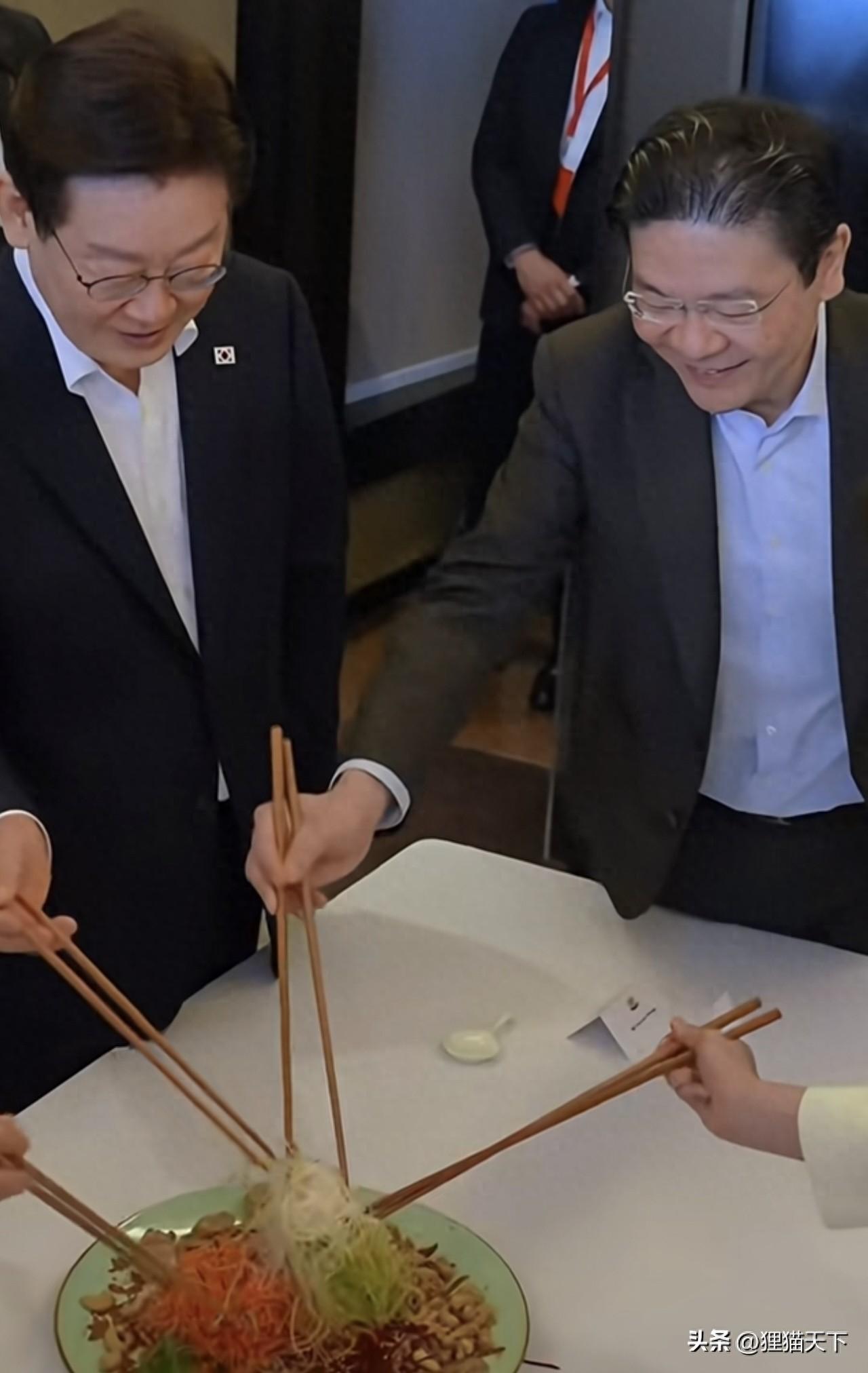 這是黃循財邀請李在明一起參加活動的場面,訪問期間恰逢新加坡的華人過年,於是邀請李在明一起體驗過年習俗撈魚生,兩個人都非常開心。黃循財還跟李在明並排走,一邊走路一邊輕拍對方肩膀,說說笑笑就跟好朋友團聚似的。
