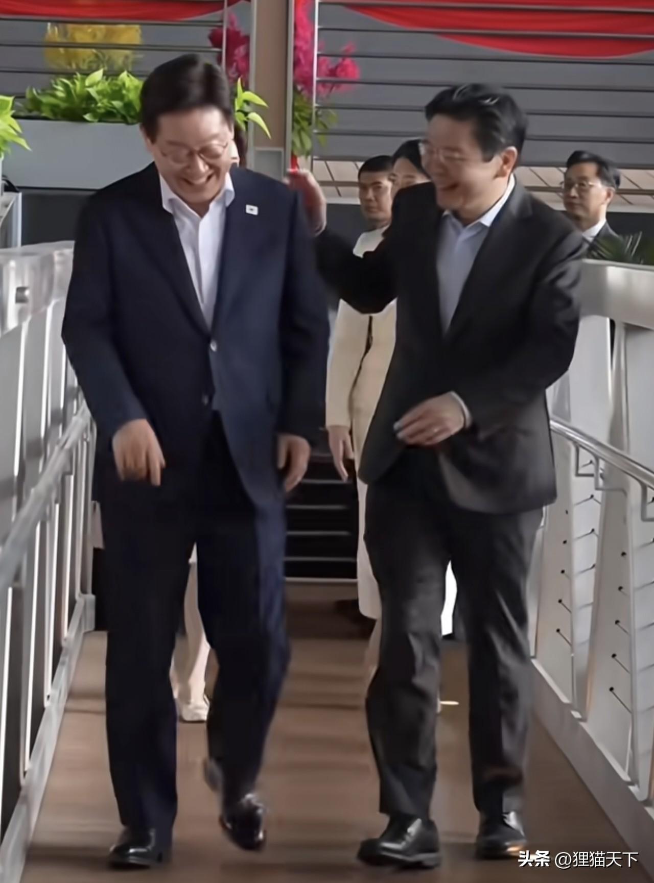 這是黃循財邀請李在明一起參加活動的場面,訪問期間恰逢新加坡的華人過年,於是邀請李在明一起體驗過年習俗撈魚生,兩個人都非常開心。黃循財還跟李在明並排走,一邊走路一邊輕拍對方肩膀,說說笑笑就跟好朋友團聚似的。