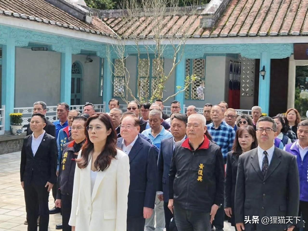 這是鄭麗文等人在慈湖蔣陵的合影,鄭麗文站在最前面,因爲謁陵是嚴肅的場合,所以他們穿的衣服顏色比較素。其中還有一些穿了工作服,衣服上還有他們各自的名字。可以看到前排的有黃復興,他旁邊挨着打領帶的蕭旭岑,身後有尹乃菁,還有鄭麗文斜後方的張榮恭,這幾個都是比較重要的人員。