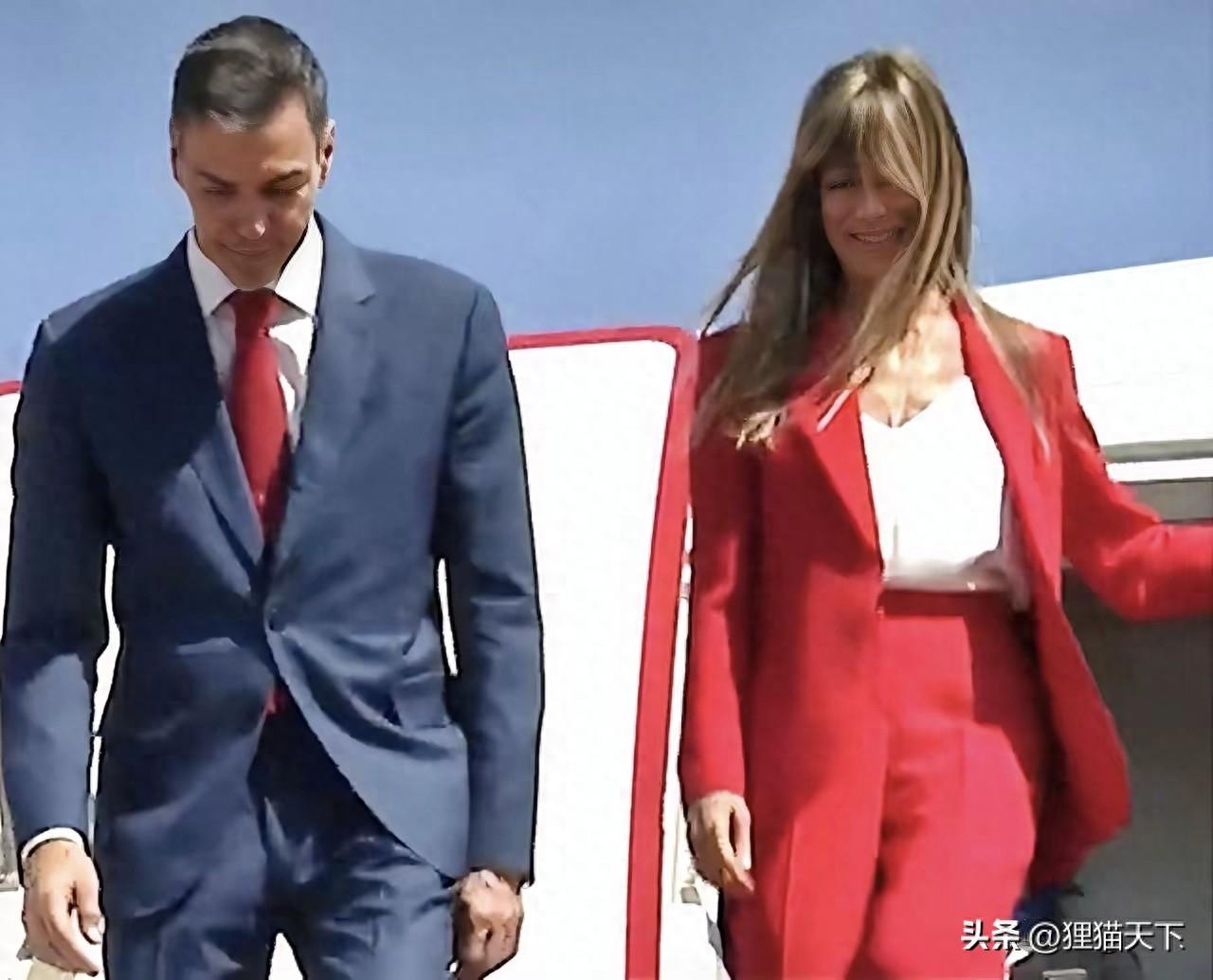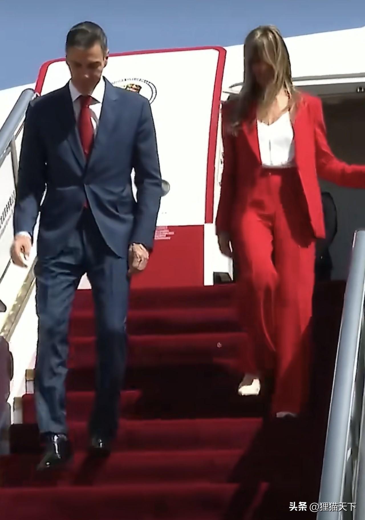 西班牙首相桑切斯應邀來華訪問,這是他四年內第四次訪華,陪同來訪的還有他的妻子貝戈尼婭·戈麥斯。這是西班牙的第一夫人,她下飛機時穿了一身紅色西裝,跟丈夫的紅領帶呼應,顯得很亮眼。