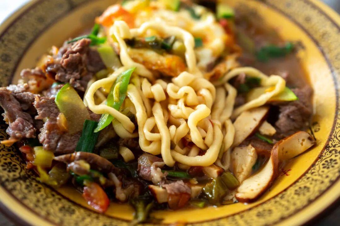 區別於打面,彈面贏在彈性上,在麪糰里加入了雞蛋,口感更柔韌。彈麪館的澆頭多以爆炒爲主,燒製得也更入味。