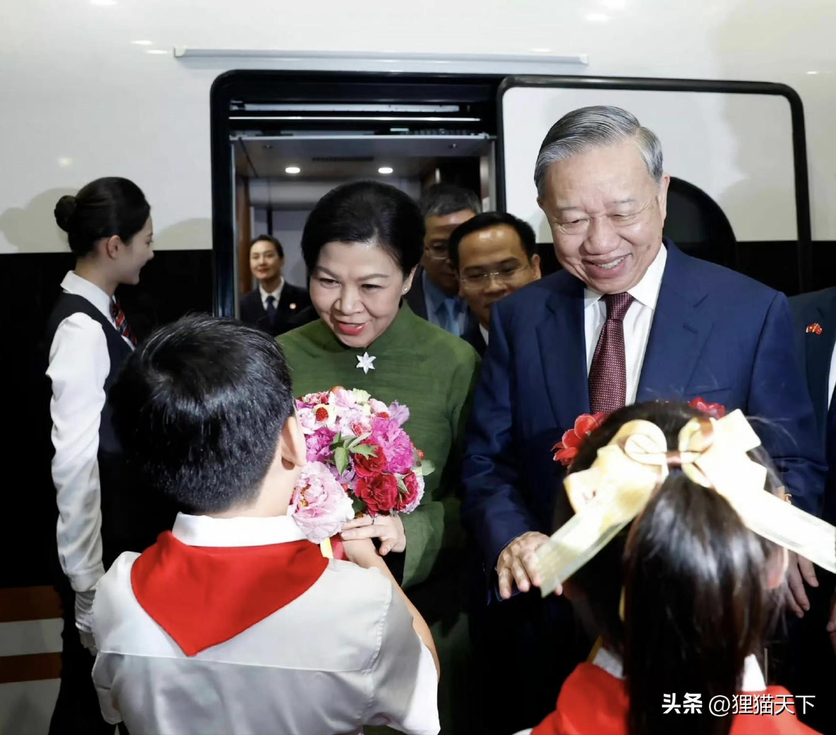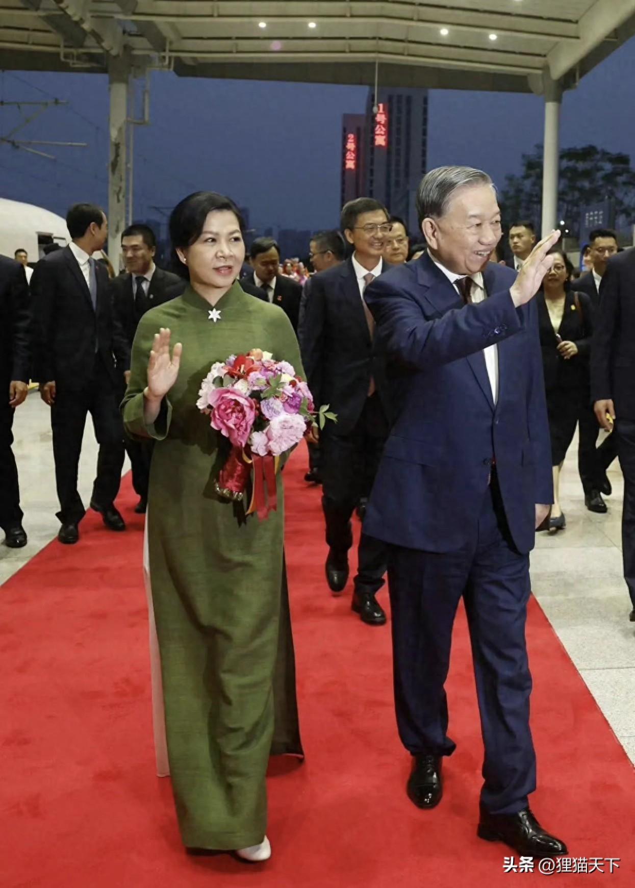 越南的蘇林訪問行程來到了廣西南寧,他夫人吳芳璃一起隨行。這是他們抵達南寧走出高鐵的畫面,吳芳璃換了一件綠色長裙,走在紅毯上剛好紅綠襯托,而且南寧有綠城之稱,這衣服顏色很適合來南寧的時候穿。
