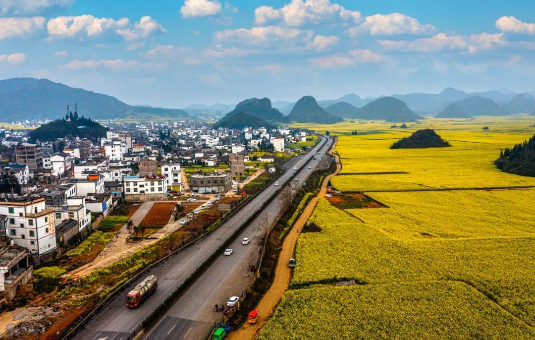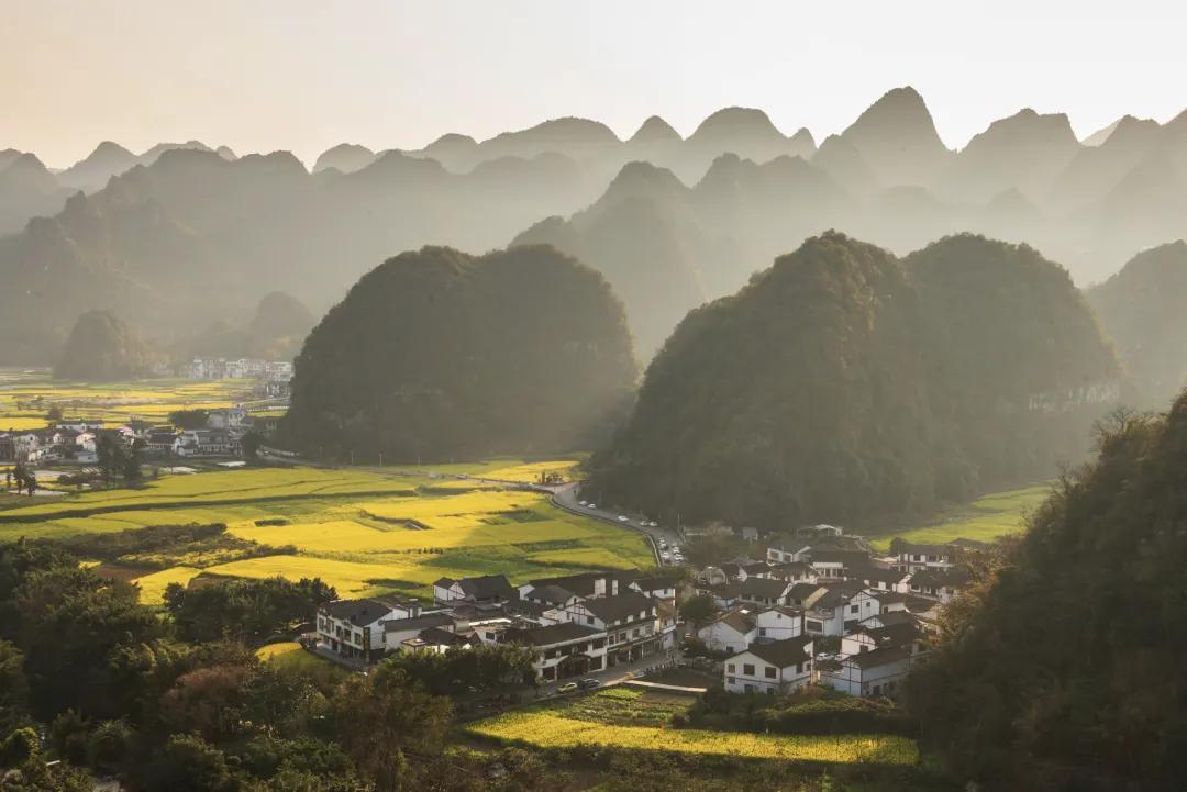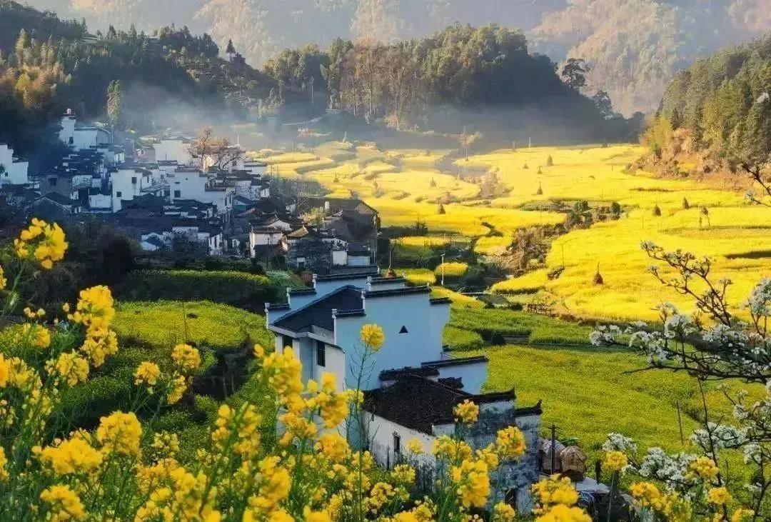 油菜花層層疊疊,粉牆黛瓦的徽派建築若隱若現,這不就是妥妥的田園畫卷嘛!