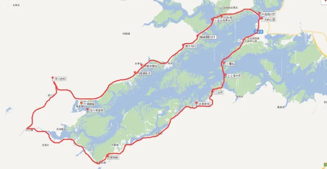 途徑點:淳安縣城 → 淳楊線(南線)→ 上江埠大橋 → 下姜村 → 芹川古村 → 淳開線(北線)→ 竹裏觀景臺 → 紅葉灣 → 天嶼山 → 返程